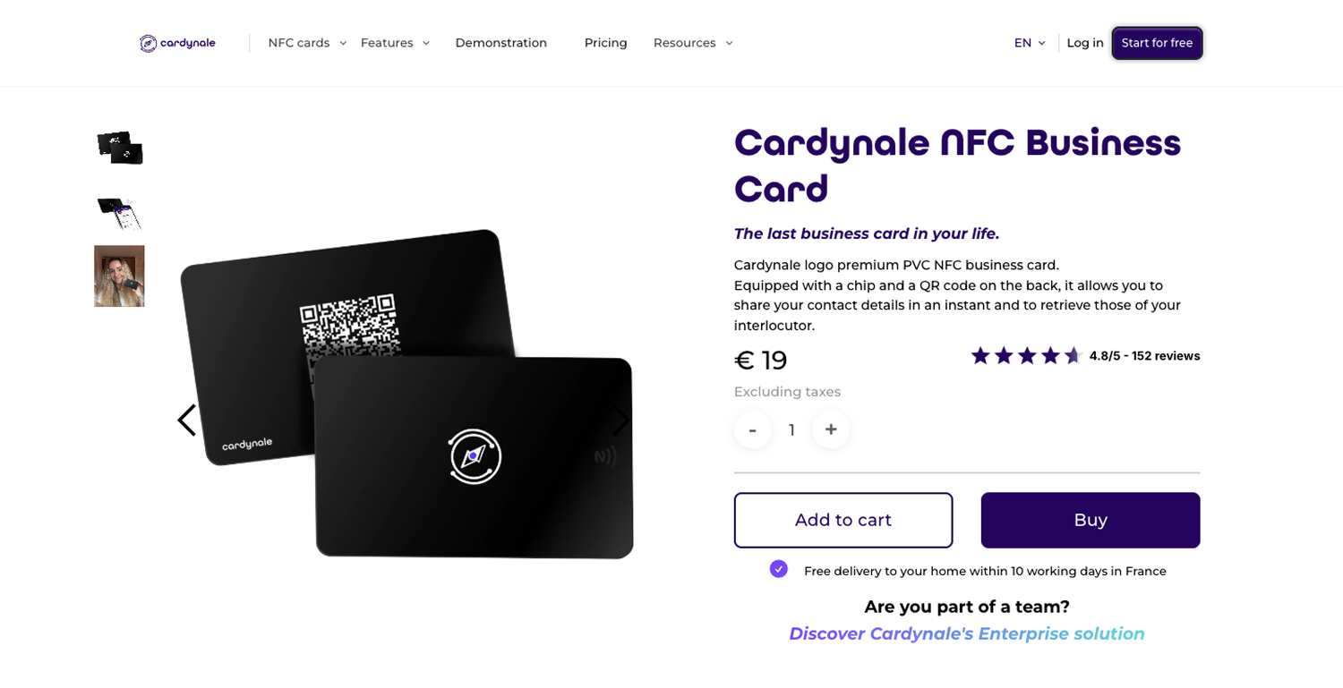 Cardynale biedt digitale en fysieke visitekaartjes in premium materialen, elk met meerdere varianten in kleur en ontwerp. Ze werkten al in Webflow vanwege de designvrijheid, maar liepen vast op productbeheer, een stroef afrekenproces en handmatig werk rondom meertaligheid. De checkout voelde niet premium genoeg voor het product.