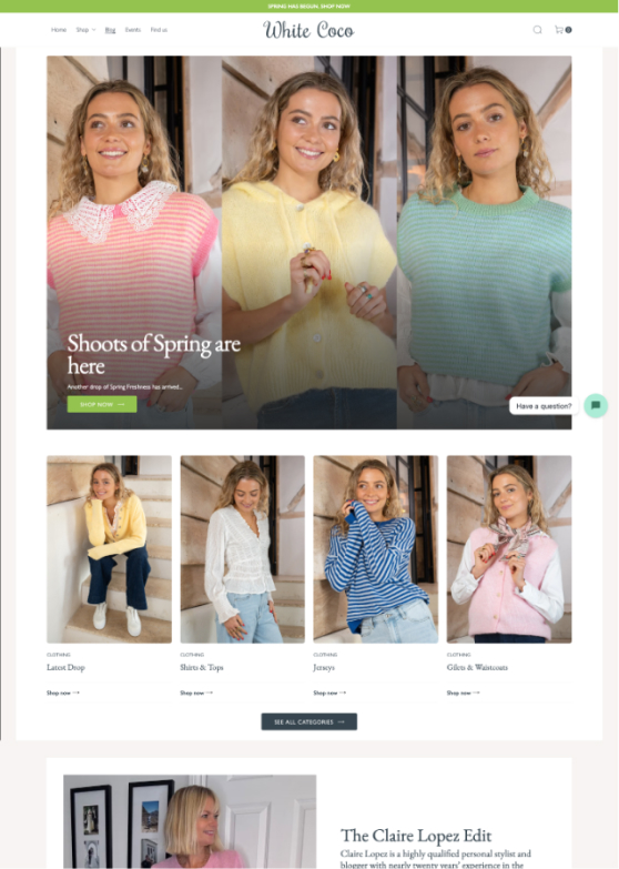White Coco is een Britse fashionretailer met drie fysieke winkels en een groeiende webshop. Met ruim 850 producten online en een complex voorraadbeheer over meerdere locaties, liep het bestaande platform tegen zijn grenzen aan. Shopify bood de backend, maar de standaard templates pasten niet bij de premium uitstraling van het merk.
